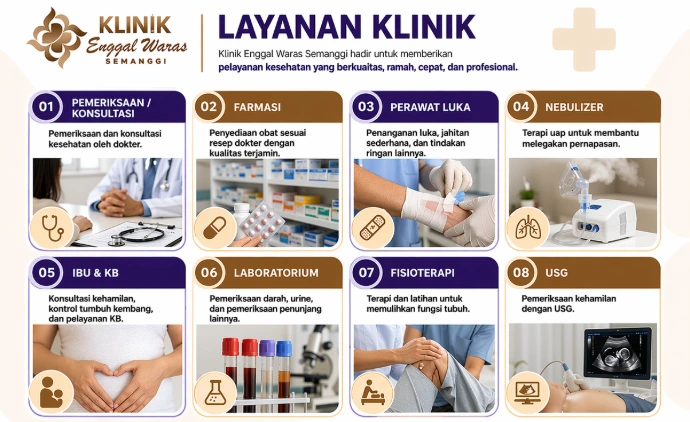 Klinik Enggal Waras Semanggi hadir sebagai fasilitas layanan kesehatan yang berkomitmen memberikan pelayanan terbaik bagi masyarakat.